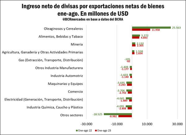 En línea con lo comentado anteriormente, la sequía no dio tregua este año y fue el principal factor que complejizó el panorama: si comparamos el ingreso neto acumulado de divisas por el sector Oleaginosos y Cerealeros entre enero y agosto del 2023 contra el mismo período en 2022, se observa que los ingresos del principal sector exportador argentino mermaron en 13.605 millones de dólares, a menos de la mitad del año previo (-53%). Por su importante participación, ninguno de los otros sectores puede contrarrestar esta fuerte caída.