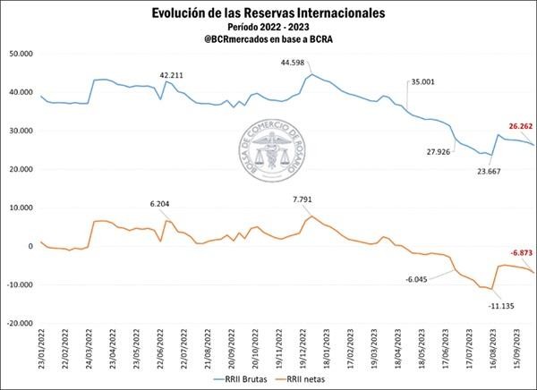 La dinámica de las reservas internacionales ha sido muy poco auspiciosa este año. A pesar de ubicarse las reservas brutas en 26.262 millones de dólares a principios de octubre, las netas* (de libre disponibilidad, que se obtienen descontando a las reservas brutas aquellas que se encuentran comprometidas mediante un pasivo de corto plazo) se encuentran en terreno negativo desde abril, en torno a los 6.900 millones, incluso luego de haber recibido el último desembolso del FMI en agosto