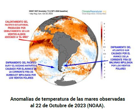 Pero, aunque el presente episodio de “El Niño” es sumamente vigoroso, y ya ha hecho sentir sus efectos sobre varias Regiones del Mundo, es muy probable que sus efectos sobre el Cono Sur resulten perturbados por una fuerte actividad de los vientos polares, que impulsan las corrientes frías de Humboldt y Malvinas a lo largo de las costas de Sudamérica, obstaculizando la entrada de humedad hacia el interior del Continente (Figura Superior).