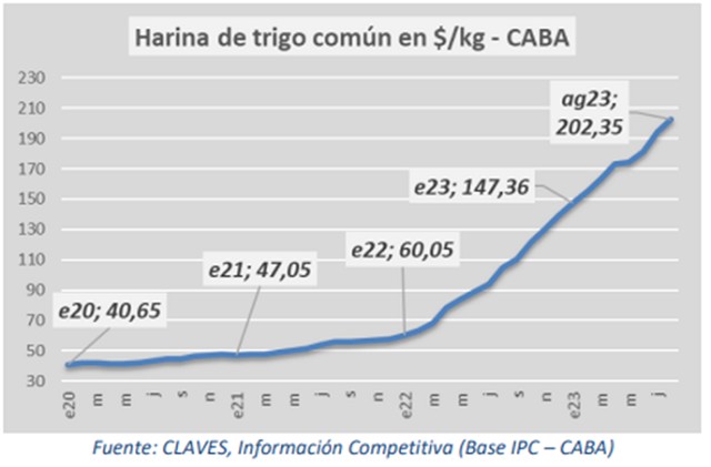 El precio de la harina común al consumo según el IPC de CBA pasó de 40,65 pesos el kilo en enero del 2020 a 202,35 pesos el kilo en agosto del 2023. Esto significa que creció en este período un 398%. En el plano internacional los precios obtenidos por las ventas externas desde el 2019 fue de 332 dólares FOB la tonelada y en el 2022 el promedio de 470 dólares FOB la tonelada. Este crecimiento viene del conflicto Rusia y Ucrania y el menor volumen ofertado por Argentina hacia Brasil y Bolivia.