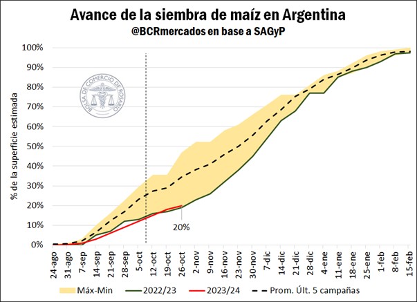 En cuanto al avance de siembra del cereal, los datos oficiales muestran que durante la última semana la implantación del cultivo progresó 2 p.p., lo que advierte un avance promedio total de 20% en el país, 1 p.p. por delante de los registros de igual fecha del año anterior. No obstante, la siembra continúa retrasada en relación con los promedios históricos, considerando que en los últimos 5 años el avance promedio de la siembra de maíz era del 35% para el mismo período.