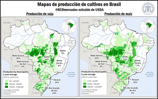 Brasil es uno de los productores agrícolas más grandes del mundo, ocupando el primer puesto entre los productores mundiales de soja y el tercer puesto en el caso del maíz. Adicionalmente, sus exportaciones de soja lideran el mercado, mientras que en la campaña actual sus ventas externas de maíz llevaron a que el país desplace a Estados Unidos y se posicione también como el primer exportador mundial del cereal.