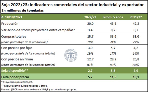 De acuerdo con los datos mencionados y con estimaciones propias sobre la variación de stocks entre campañas y el uso interno de la oleaginosa como semillas, balanceados y otros, se observa que la disponibilidad de soja por vender alcanza apenas 2,7 Mt.
