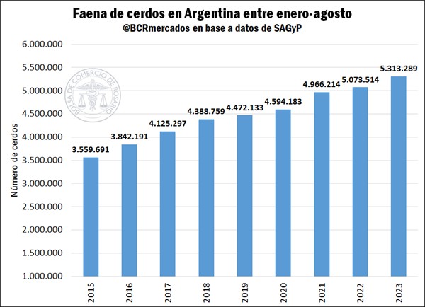 El último informe de Rosporc reveló que el sector porcino ha alcanzado un hito destacable, marcando 2023 como el decimotercer año consecutivo de crecimiento. Este dato sobresale aún más al destacar que, solo en los primeros ocho meses del año, se faenaron 5,3 millones de cabezas porcinas, un aumento del 5% en comparación con el mismo período de 2022. Esta cifra representa un récord histórico para el país en este lapso anual.