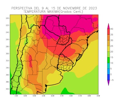 Al comienzo de la primera etapa de la perspectiva se observarán precipitaciones sobre el norte del área agrícola, a la vez que se mantendrán temperaturas algo bajo lo normal debido a la entrada de aire polar en los días precedentes, pero los vientos del trópico regresarán con mucho vigor, reactivando la ola de fuerte calor sobre el norte del área agrícola mientras el centro y el sur observarán registros moderados, y sólo la franja atlántica recibirá vientos marinos que provocarán valores bajo la media estacional. • El este del NOA, el este de Cuyo, el norte de Entre Ríos, el oeste de la Región Pampeana y el noroeste del Uruguay observarán temperaturas máximas superiores a 30°C con varios focos con valores entre 35 y 40°C, que se ubicarán hacia el norte y en el centro de Cuyo.