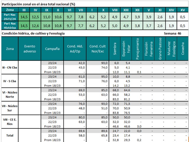 Este progreso se debe principalmente al avance alcanzado en ambos núcleos, el Norte de La Pampa – Oeste de Buenos Aires, Sur de Córdoba y Entre Ríos, donde las lluvias precedentes han dejado humedad superficial para iniciar las labores. Por otro lado, podrían destinarse a soja cuadros del Núcleo Norte que inicialmente hubieran ido a planteos tempranos de maíz, y lotes del Norte de La Pampa – Oeste de Buenos Aires que han sido excluidos de la intención de siembra de girasol.