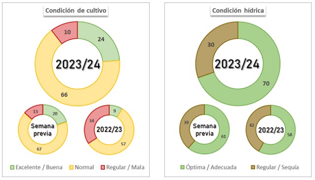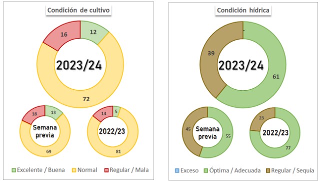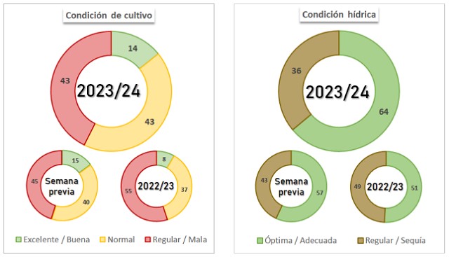 Se ha sembrado el 24,7 % de las 7,3 MHa estimadas para la presente campaña. Del total implantado, el 89,6 % transita los primeros estadios de desarrollo con una condición entre Normal y Buena.