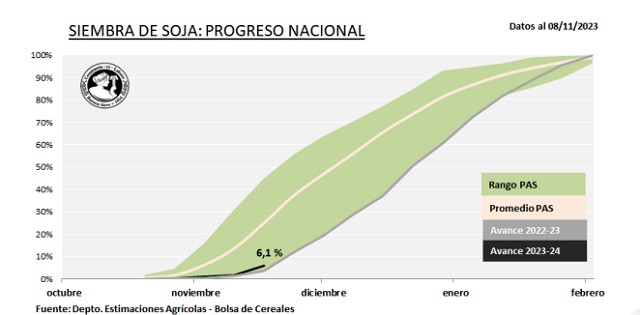 Luego de las lluvias de fin de octubre y principio de noviembre, con un 6,1 % de las 17,1 MHa proyectadas, se inicia la siembra de la oleaginosa, marcando un adelanto interanual de 2,4 p.p