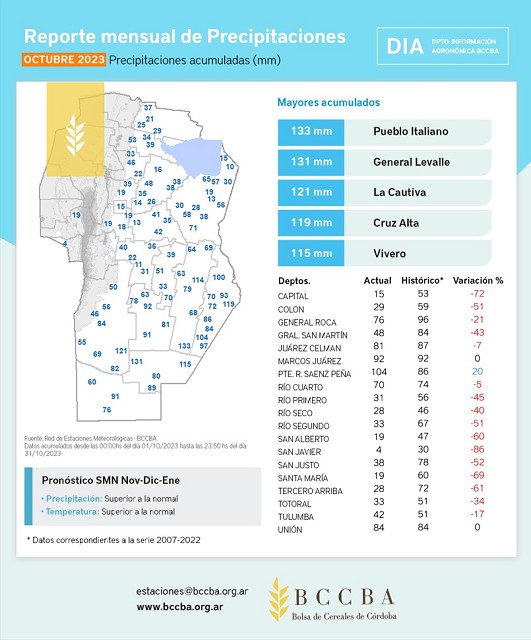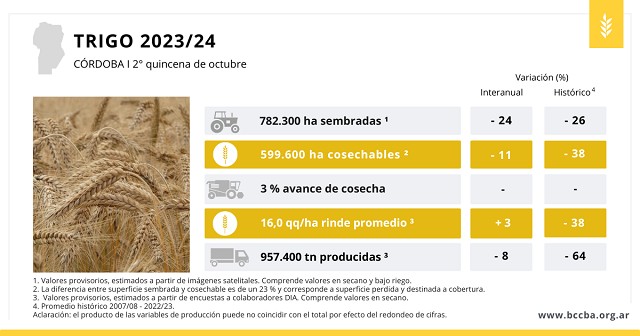 De las 782 mil hectáreas sembradas con el cereal, el 11 % se destinaría como cobertura, siendo los departamentos de San Alberto, Calamuchita y General Roca los que mayor proporción del área dedicarían a tal fin. Hasta el momento, la superficie perdida alcanza el 14 % de las hectáreas destinadas a producción de grano, proporción que se sitúa por debajo de la correspondiente a la campaña 2022/23, la cual fue del 25 %.