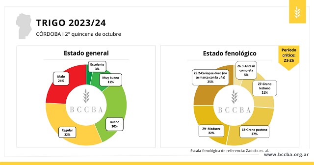Esta tendencia negativa en las variables productivas respecto a campañas anteriores refleja el contexto de estrés térmico por temperaturas extremas, e hídrico por escasez de precipitaciones y bajas reservas de agua en el perfil bajo las cuales el cultivo atravesó gran parte de su ciclo, principalmente el período crítico. Hacia finales de octubre, gran parte de los lotes del cereal se encontraba iniciando el llenado de granos y la mayor proporción de la superficie triguera se hallaba en regular y malas condiciones generales.