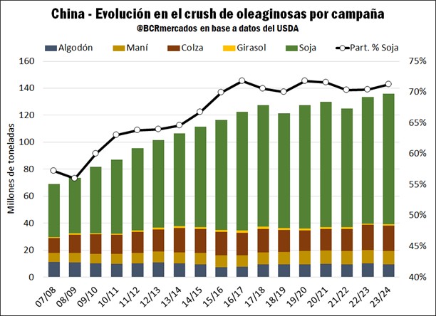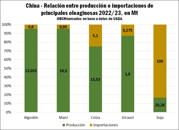 Considerando el abastecimiento de la industria de crushing en China, entre las principales oleaginosas la mayor dependencia de importaciones es en el caso de la soja. En la campaña 2022/23 la producción de soja en China fue de 20 Mt y las importaciones alcanzaron las 100 Mt, es decir, el 83% de la oferta (sin incluir stocks iniciales) se obtuvo del fruto de las importaciones, teniendo como principales oferentes y competidores de este producto a Estados Unidos y Brasil.