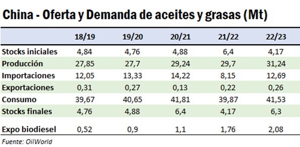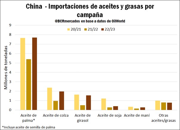 En el caso específico del mercado de aceites y grasas en China, en la campaña 2022/23 la producción fue de 31,24 Mt, de las cuales 17 Mt fueron aceite de soja y 4,3 Mt aceite de colza. Es decir, el 70% de la producción de aceites y grasas se concentra en esos dos productos. Mientras tanto, las importaciones totales fueron de 12,69 Mt, un aumento del 55% respecto al ciclo comercial previo. Esto se explica por la reapertura de la economía desde octubre de 2022 y la reducción de precios en los mercados de aceites tras las subas iniciadas a finales de febrero de 2022 con el comienzo de la invasión de Rusia a Ucrania.