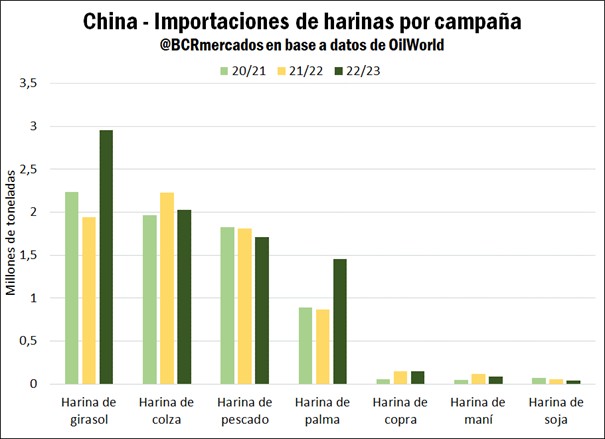A nivel específico, las importaciones de harina de girasol se incrementaron en 1 Mt hasta 2,96 Mt en 2022/23, de las cuales 2,1 Mt tuvieron origen en Ucrania, 0,3 Mt en Rusia y 0,5 Mt en Bulgaria. Por otro lado, se destacó el gran incremento en las importaciones de harina de palma que alcanzaron 1,4 Mt, una suba de 68% respecto al año comercial previo. Por su parte, las importaciones de harina de soja y maní si bien son muy bajas se consolidaron a la baja en 40.000 y 87.000 toneladas respectivamente. En este sentido, se destaca que China no es un comprador habitual en el mercado de harina y aceite de soja, dado que se enfoca exclusivamente en las compras de soja sin procesar para luego abastecer su gigantesca industria doméstica y agregar valor internamente.