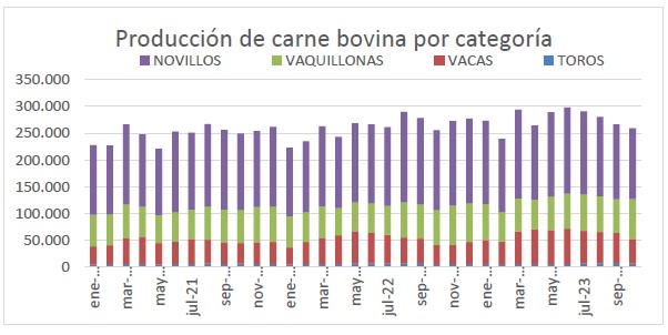 La producción de carne bovina del mes de octubre de 2023 alcanzó las 259,0 mil toneladas res con hueso, retrocediendo en 7,5 mil toneladas con respecto al mes anterior; y creciendo en 3,5 mil toneladas, con respecto al mes de octubre del año pasado. En los primeros diez meses del año 2023, la producción de carne bovina alcanzó los 2,75 millones de toneladas equivalente res con hueso; situándose 171,3 mil toneladas por encima del acumulado del período enero a octubre de 2022, que había ascendido a 2,58 millones de toneladas equivalente res con hueso.