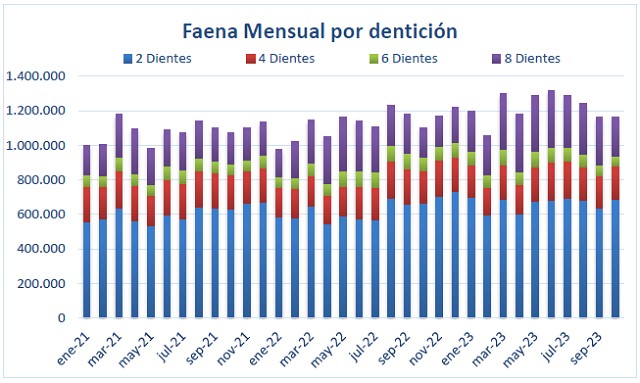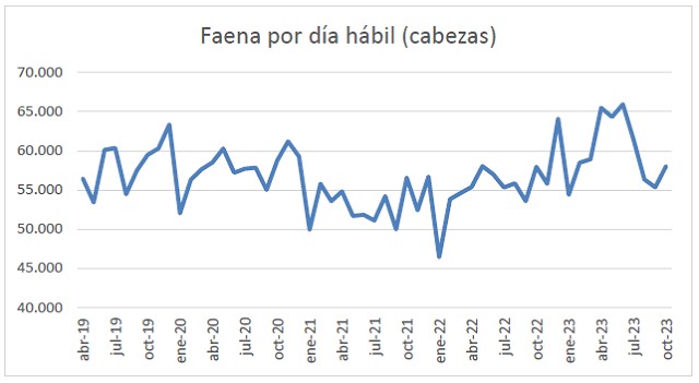 La faena diaria del mes de octubre del corriente año, se ubicó en 58,0 mil cabezas, un (+4,9%) por encima de las 55,3 mil diarias procesadas en septiembre último, y un (+0,2%) por encima de las 57,9 mil correspondientes a octubre de 2022.