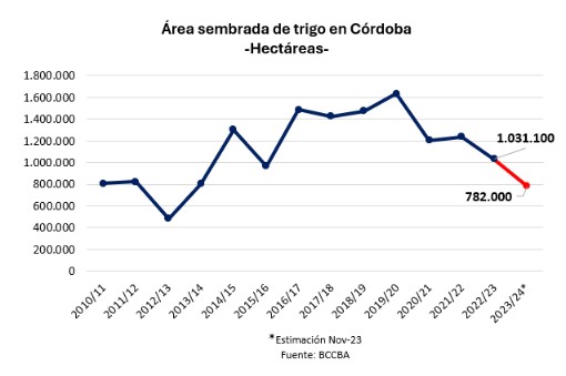Durante el primer semestre del 2023 el “El Niño” no se hizo presente y, con él, tampoco las esperadas lluvias. Partiendo de la condición hídrica heredada de la campaña previa y, sumando lo anterior, durante la ventana de siembra los suelos presentaban escasez de humedad en gran parte del territorio cordobés. Esta situación provocó una caída en el área sembrada de trigo, esperando futuras lluvias para ser aprovechadas por los cultivos estivales. En línea a lo anterior, el área sembrada para el cereal en la campaña 2023/24 se ubican en aproximadamente 782.000 hectáreas, disminuyendo un 24% interanual.