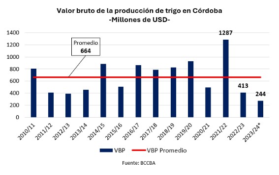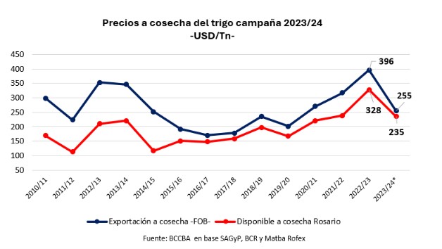 Con estos precios para el cereal, el valor bruto estimado para la producción 2023/24 sería de USD 244 millones, el valor más bajo considerando la serie histórica de la BCCBA. Este valor se obtiene multiplicando la producción por el precio de exportación, y representa los ingresos totales para todos los actores de la cadena, incluido los derechos de exportación. Comparando con las campañas previas, el valor bruto de la producción sería USD 420 millones menor al promedio histórico y USD 169 millones más bajo que el de la campaña anterior.