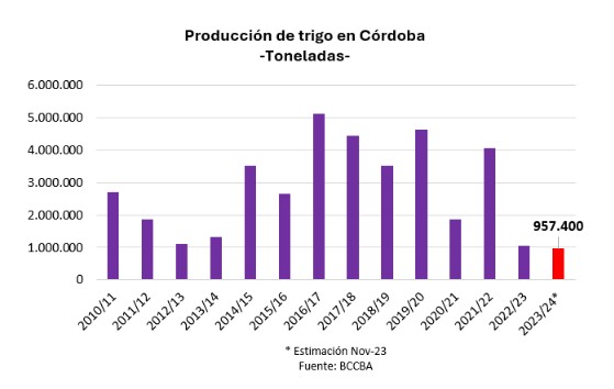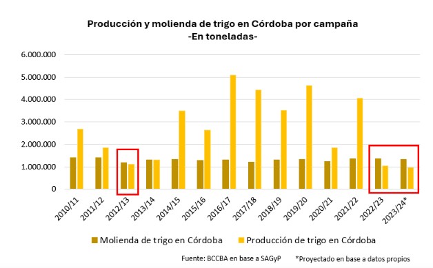 En relación con la industrialización del cereal, Córdoba transforma, en promedio, 1,3 millones de toneladas de trigo. Generalmente, la provincia cosecha un volumen superior de trigo del que industrializa, llegando a producir hasta cinco veces el trigo molido en una campaña. Sin embargo, para la campaña en curso, se espera una producción de poco más de 957.400 toneladas la cual no llegaría a cubrir la necesidad de los molineros como ha ocurrido en las campañas anteriores (2012/13-2022/23) por lo que Córdoba tendría que importar trigo de provincias vecinas o industrializar un menor volumen.