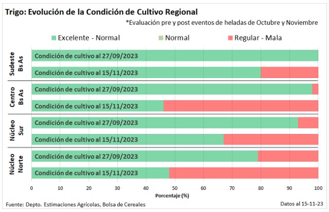 Finalmente, para el cultivo de cebada, luego de evaluar los daños por las heladas ocurridas durante el mes de octubre, colaboradores informan heterogeneidad en las mermas de rinde, en donde se citan daños en la punta de espiga, principalmente sobre el Núcleo Sur, Norte de La Pampa-Oeste de Buenos Aires y Centro de Buenos Aires, donde la helada ocurrida el mes previo encontró al cultivo transitando la etapa de espigazón. Esto último reduce nuestra proyección de producción a 4,7 MTn