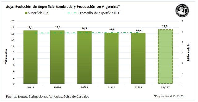 Aumenta la superficie de la oleaginosa en 200 mHa, llegando a las 17,3 MHa. La siembra de soja cubre el 18 % de las nueva proyección de superficie, con un adelanto interanual de 6 p.p.