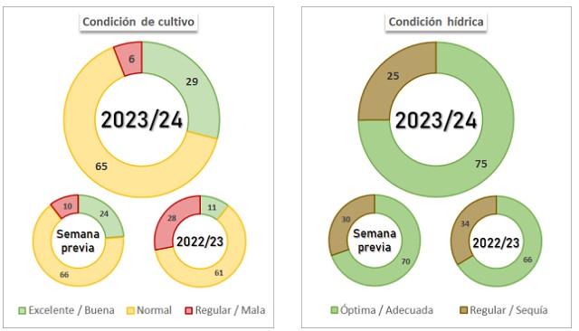 Se ajusta la proyección de producción para la campaña 2023/24 en 4,71 MTn, debido a la ocurrencia de heladas tardías. Al presente informe ya se recolectó el 2,2 % de la superficie apta.