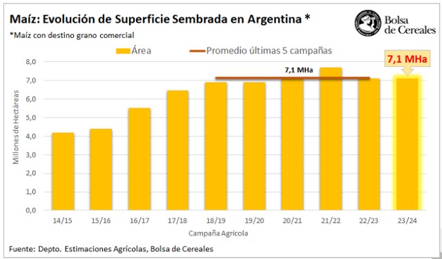 La falta de lluvias al comienzo de la primavera afectó la siembra temprana por lo que reducimos nuestra proyección de superficie en 200.000 Ha que en gran parte pasarían a soja de primera. Nuestra nueva proyección es de 7,1 MHa
