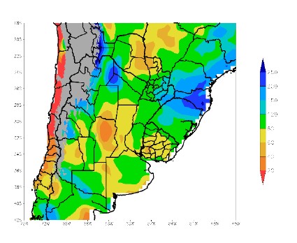 Al mismo tiempo, este proceso obstaculiza la entrada de humedad hacia el interior del área agrícola (áreas en tonos de amarillo a naranja), y deprime lo mecanismos de precipitaciones, generando una amplia extensión con déficits hídricos, que se extiende sobre el interior de La Argentina y el Uruguay, el centro y el nordeste del Paraguay, las zonas cercanas del Brasil y el sur de la costa atlántica.