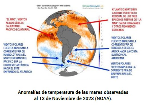 El fenómeno de “El Niño” 2023/2024, continúa su desarrollo con vigor, como lo señala la fuerte anomalía positiva de las aguas del Pacífico Ecuatorial, haciendo sentir sus efectos sobre Australia, La India, y otras Regiones del Mundo.
