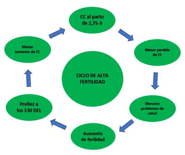 Diversos estudios demuestran que las mejores tasas de concepción a primer servicio se logran en animales que ganan peso post parto. Para lograr esto es clave monitorear la condición corporal del rodeo ya que, si el animal está en balance energético negativo y pierde peso, el éxito en la inseminación es muy bajo.