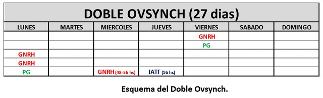 ¿En qué consiste el Doble Ovsynch? El Doble Ovsynch es un protocolo de inseminación a tiempo fijo desarrollado con el fin de superar limitaciones de la pre sincronización convencional. El presynch se reemplaza por un Ovsynch inicial y a los 7 días arranca el segundo Ovsynch. Estudios comparativos indican que las vacas tratadas con Doble Ovsynch tuvieron mejores tasas de concepción a la primera inseminación comparadas con las vacas en el tratamiento de Presynch- Ovsynch convencional. En consecuencia, se espera que Doble Ovsynch tenga mejor fertilidad de forma consistente en diferentes explotaciones lecheras y es por eso que es muy utilizado en los Estados Unidos.