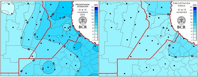 Algunas localidades están cerca de casi triplicar la media estadística quincenal: Rosario 108 mm, Pergamino 107 mm, Irigoyen 106 mm, Clason 104 mm, Montes de Oca 101 y Godeken 100 mm. Para los próximos días se espera que regresen las lluvias. “La primera quincena de noviembre consolidó definitivamente el cambio positivo en el patrón de lluvia. Con el forzante Niño instalado, y presente hasta el otoño, podemos pensar en los valores medios de precipitación como piso para el mes de noviembre”, dice Elorriaga.