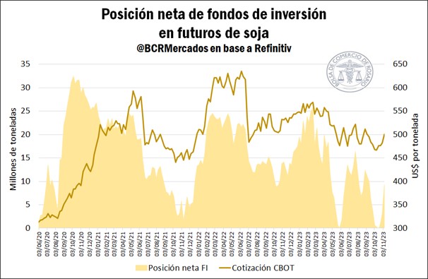 Habida cuenta del tradicional liderazgo argentino como proveedor mundial de harina de soja, la escasez de oferta gatilló una suba del 22% en el contrato de harina de soja negociado en CBOT desde octubre, que alcanza máximos de marzo de este año. Los fondos especulativos han aumentado su posición comprada neta desde el último dato de octubre y sostiene en gran parte las cotizaciones.