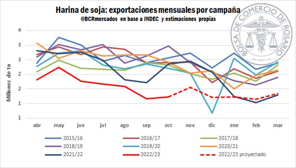 Si se pretende encontrar volúmenes de exportación más bajos para los últimos cinco meses de la campaña habría que retroceder al ciclo 2000/01, cuando se exportaron 5,7 Mt de harina de soja entre noviembre y marzo. En el caso del aceite de soja habría que remontarse al siglo pasado. En cuanto a biodiesel, representa el volumen más bajo desde la promulgación de la primera ley de biocombustibles.