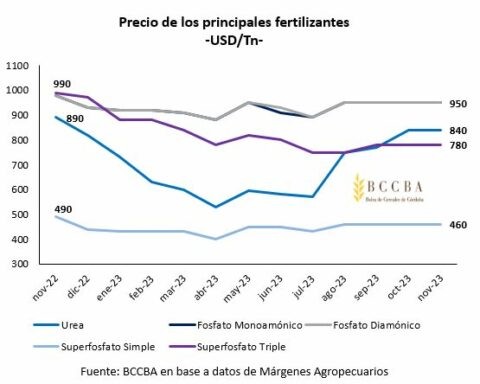 Considerando la urea, fosfato monoamónico y diamónico y el superfosfato simple y triple, los precios han disminuido interanualmente, experimentando variaciones del -3% (como el caso de los fosfatos, cuya línea se superpone), del -6% (como la urea y el superfosfato simple) y del -21% para el superfosfato triple, cuyo precio varió de USD 990 por tonelada en noviembre de 2022 a USD 780 por tonelada en noviembre de 2023.