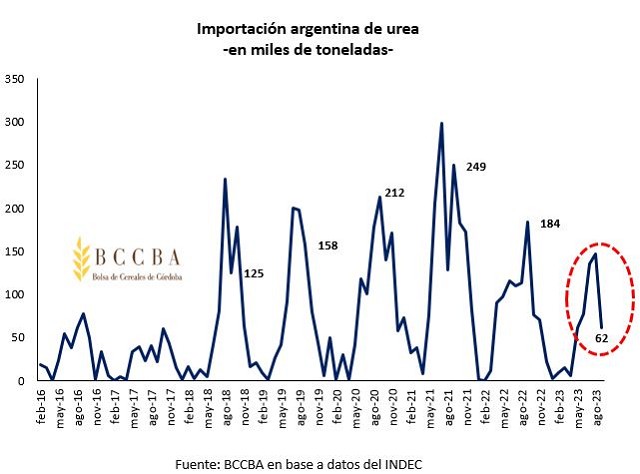 Si se considera el mercado externo, la importación de urea en septiembre del corriente año, según datos del INDEC, ha caído un 66% comparado con septiembre del año pasado, pasando de 184 mil a 62 mil toneladas importadas. Además, se establece como uno de los valores mas bajos para el mes de los últimos 5 años.