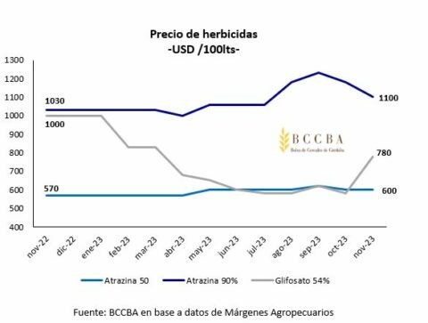 En cuanto a los herbicidas que se incluyen en la relación insumo producto, se contabiliza al glifosato y atrazinas. Por un lado, el glifosato enfrentó una caída en su precio pasando de USD 1000 por tonelada en noviembre de 2022 a USD 780 por tonelada en noviembre de 2023. Por otro lado, la atrazina 50 y la de 90% experimentaron un aumento en los precios del 5% y 7% respectivamente.