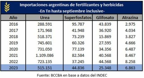 Se estima que Argentina importa un 70% de los fertilizantes que utiliza para su producción agropecuaria. En los últimos meses a raíz de complicaciones macroeconómicas y, además, por falta de aprobación desde el Sistema de Importaciones de la República Argentina (SIRA), la importación de fertilizantes como la urea y herbicidas como el glifosato se encuentran limitadas, con la particularidad de que el precio de las ventas internas que se logran concretar no se fijaría sino hasta el año que viene.