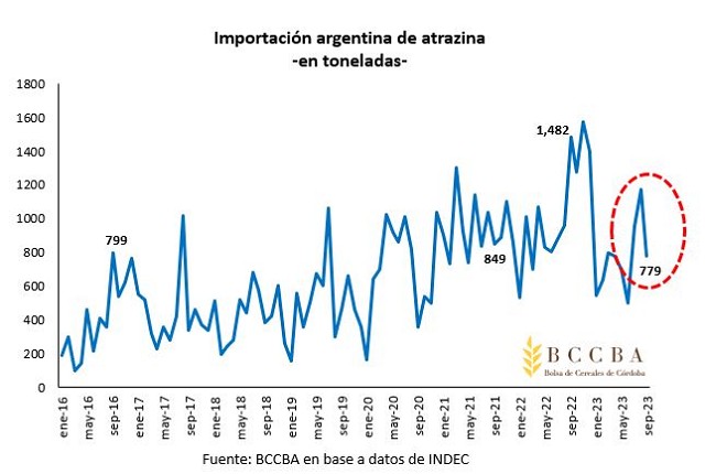 En cuanto al mercado de la Atrazina, se observa una tendencia alcista en la cantidad importada de los últimos años. Sin embargo, para el mes de noviembre del corriente año la importación se ubicó en 779 toneladas un 47% por debajo de lo que se importó en noviembre del año pasado, que fue de 1.482 toneladas. A pesar de lo anterior, considerando dicho mes, pero en los años pasados, el precio de la Atrazina en noviembre del 2023 se encuentra como el cuarto valor más alto.