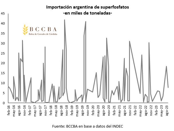 Por su parte, la importación de superfosfatos hasta el mes de septiembre se ubica como la más baja de los últimos 7 años, sumado a que tiene una diferencia de 28.350 toneladas respecto al segundo valor más bajo.