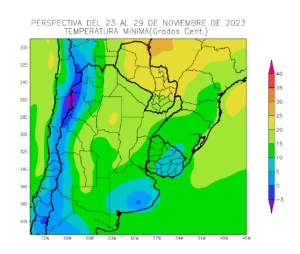 Al inicio de la perspectiva se observarán temperaturas sobre lo normal, pero la entrada de una masa de aire polar, hará descender las marcas termométricas en la mayor parte del área agrícola, a excepción de su porción centro norte, que observará registros normales, mientras el sudeste de la Región Pampeana y el Uruguay podrían observar heladas localizadas, con un foco de heladas generales sobre las Serranías Bonaerenses. Los vientos del trópico regresarán rápidamente y con vigor, incrementando la temperatura por encima de lo normal en la mayor parte del área agrícola, con un extenso foco de registros de calor extremo sobre el norte de la Región del Chaco, el centro y el oeste del Paraguay y zonas vecinas, mientras sólo la franja atlántica observará marcas cercanas a lo normal. Hacia el final de la perspectiva tendrán lugar precipitaciones de frente caliente, es decir sin que baje apreciablemente la temperatura, causando precipitaciones de variada intensidad, con focos aislados de tormentas sobre el centro del NOA, el norte de la Mesopotamia, que llevarán un alivio desuniforme a la mayor parte del área agrícola, mientras la alta cuenca del Río Paraná volverá a recibir aportes muy abundantes, contribuyendo a la crecida de los grandes Ríos.