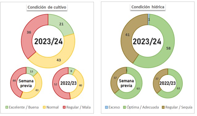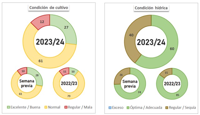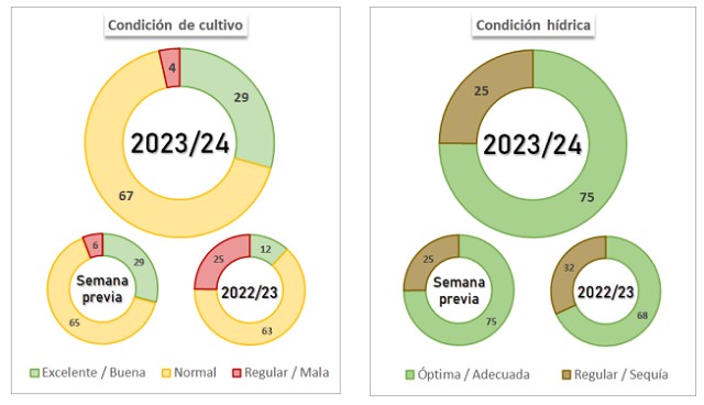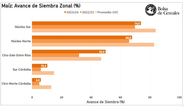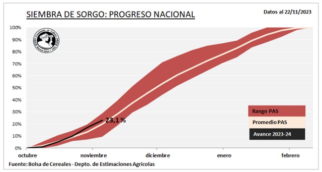 Por otro lado, a principios de noviembre se inició la siembra de sorgo granífero 2023/24. Al momento, el área implantada cubre el 23,1 % de las 950 mHa estimadas para la presente campaña. Los márgenes favorables respecto a maíz han permitido expandir el área en zonas clave para el cultivo (NEA y Centro-Norte de Santa Fe) pero la llegada de las lluvias sumada a la escasez de híbridos ha traccionado a la baja el área de sorgo en zonas marginales para su producción, resultando en un área similar a la campaña previa.