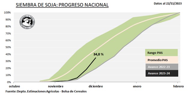 Con un avance intersemanal de 17,4 p.p. la siembra cubre el 34,8 % de las 17,3 MHa proyectadas. Se incorporan las primeras 83 mHa de soja de segunda sobre el Núcleo Norte y el Centro-Norte de Santa Fe.