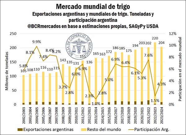 Si bien las expectativas de la campaña venidera auguran un crecimiento auspicioso, las proyecciones exportadoras todavía guardan distancia de los máximos históricos. Un exponente cercano fue el año comercial 2021/22, cuando la Argentina exportó el 7,6% del cereal del mundo. Ello representó un máximo de 14 años en participación y un máximo absoluto en volumen exportado.
