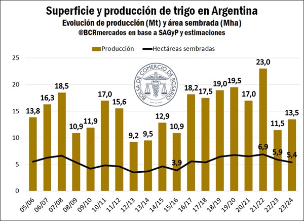 Varios siglos más tarde, la producción de trigo ha sido y es una constante en la historia productiva argentina. Hoy es el tercer cultivo en superficie y producción a nivel nacional. El trigo ocupa el 16% de la superficie que se cosechó en Argentina en la última campaña, además del 14% del volumen de granos producido en la cosecha 2022/23.