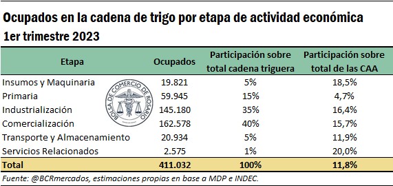 Cerca del 12% de los puestos de trabajo del agro son generados por la cadena triguera argentina, un empleo que además muestra una amplia cobertura a nivel federal, a lo largo y a lo ancho del país. La comercialización y la industrialización del trigo son protagonistas en el empleo, con la molienda, elaboración y venta de alimentos en base al trigo como principal renglón en puestos de trabajo.