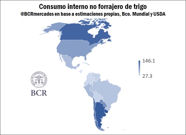 Para los 153 países de los que se disponen datos de consumo interno de trigo en bases de datos del USDA, el nuestro se ubica en el puesto 33 en consumo per cápita de trigo, segundo de Latinoamérica y tercero de América. Los primeros puestos quedan reservados para los países del Magreb y algunas exrepúblicas soviéticas en Asia. En este sentido, Azerbaiyán, Argelia y Marruecos consumen más de 190 kilos de harina de trigo por habitante por año y ocupan el podio del consumo mundial per cápita.