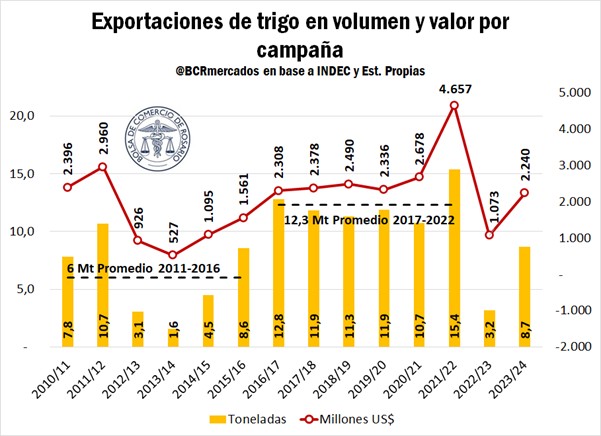 En base a esta proyección de volumen total a exportar en el nuevo ciclo y a los precios FOB vigentes para embarque durante el próximo año, se estima que el cereal está en condiciones de aportar US$ 2.240 millones por el grano enviado al exterior, más del doble del aporte generado en la 2022/23 y un monto similar al aporte realizado entre la 2016/17 y la 2020/21.