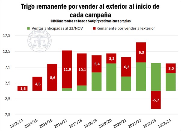 Finalmente, un aspecto que vale la pena aclarar es que buena parte del trigo ya se encuentra vendido al exterior, producto del “rolleo” de DJVE que se habilitó luego del traspié que sufrió la campaña 2022/23. Esto no implica que ya se hayan cobrado esas exportaciones, o que ya hayan ingresado las divisas al país, pero si que buena parte del trigo 2023/24 ya se ha comprometido y además ha pagado derechos de exportación.