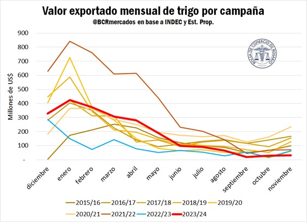 Por otra parte, ante la escasez de reservas que hoy presenta el BCRA, mucho se ha hablado del “puente” que puede tender la fina (el trigo en particular) hasta que comiencen a ingresar los dólares de la nueva cosecha gruesa en abril-mayo del próximo año. En el siguiente gráfico se presenta el valor exportado mensual de trigo por campaña y la proyección para la 2023/24.