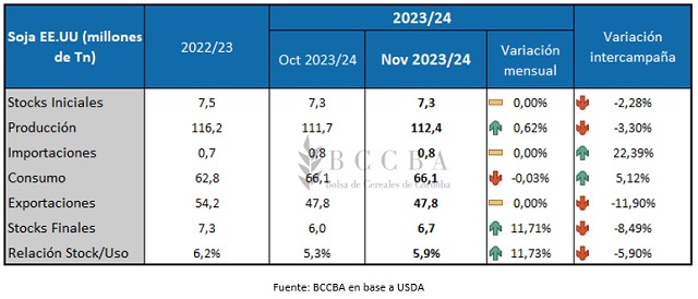 La estimación en la producción de soja estadounidense fue ajustada levemente al alza respecto al informe de octubre. Sin embargo, la magnitud de dicho ajuste (+0,62%), no produjo grandes modificaciones. El volumen producido sería el más bajo de las últimas cuatro campañas ubicándose en 112,4 millones de toneladas. El stock final proyectado de 6,7 millones de toneladas es el nivel más bajo de las últimas ocho, y a pesar de que en el presente ciclo las exportaciones de soja estadounidense disminuirían en casi un 12% respecto la campaña pasada, la relación Stock/Uso se ubicaría alrededor del 6%, dos puntos porcentuales por debajo del promedio histórico del 8%. Estas últimas estimaciones del USDA fueron menos conservadoras en producción y stocks finales respecto a las expectativas de los operadores privados, provocando una baja en el precio, al menos en la rueda diaria del día de la publicación del informe.